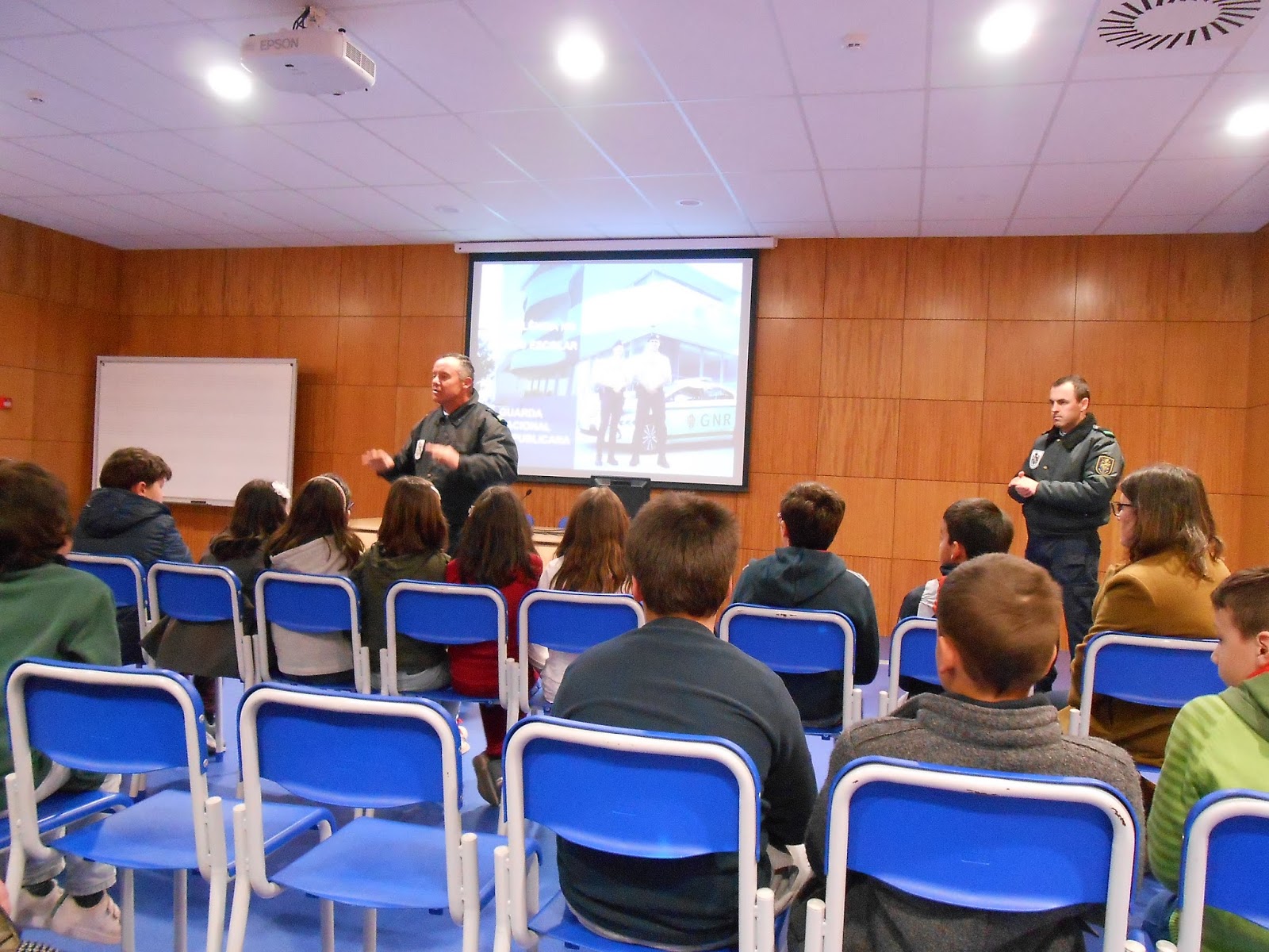 Agentes Calha e o Agente Lopes junto dos alunos do 1.º Ciclo do Ensino Básico